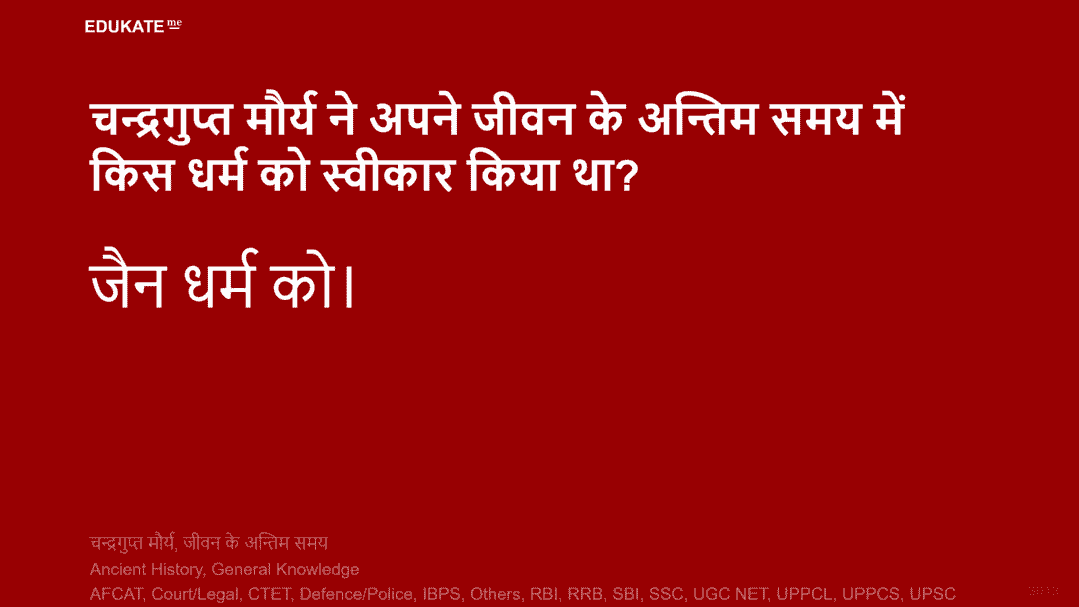 चन्द्रगुप्त मौर्य ने अपने जीवन के अन्तिम समय में किस धर्म को स्वीकार किया था?