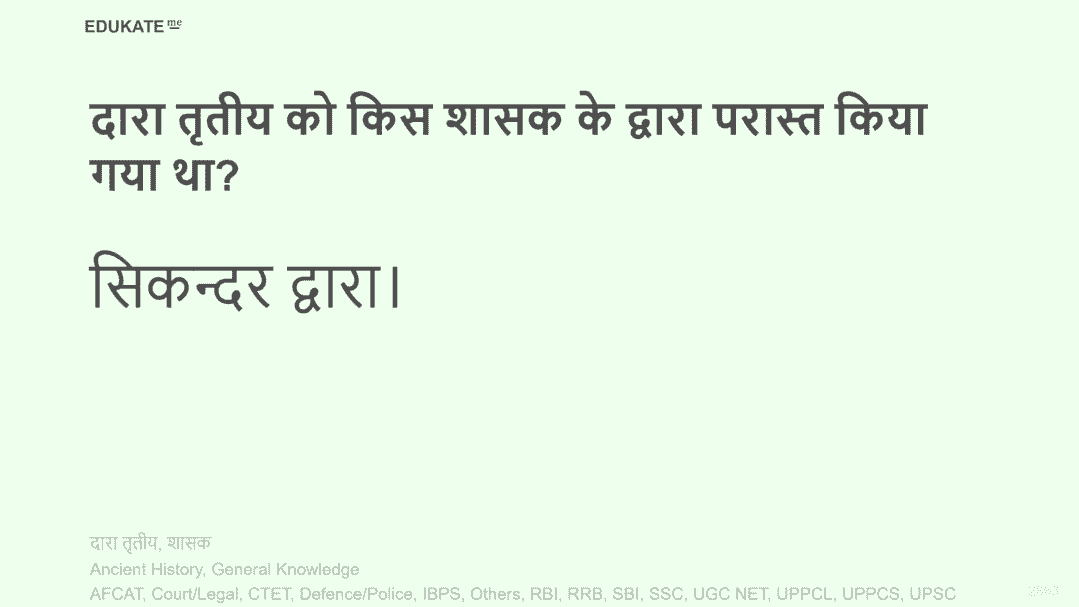 दारा तृतीय को किस शासक के द्वारा परास्त किया गया था?