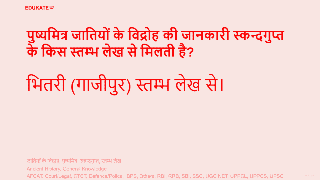 पुष्यमित्र जातियों के विद्रोह की जानकारी स्कन्दगुप्त के किस स्तम्भ लेख से मिलती है?