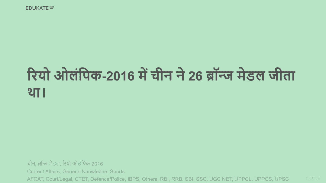रियो ओलंपिक-2016 में चीन ने 26 ब्रॉन्ज मेडल जीता था।Subscribe to our youtube channel!