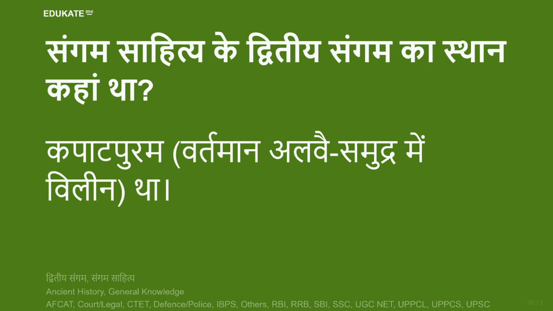 संगम साहित्य के द्वितीय संगम का स्थान कहां था?