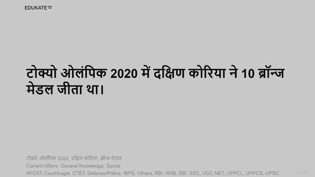 टोक्यो ओलंपिक 2020 में दक्षिण कोरिया ने 10 ब्रॉन्ज मेडल जीता था।