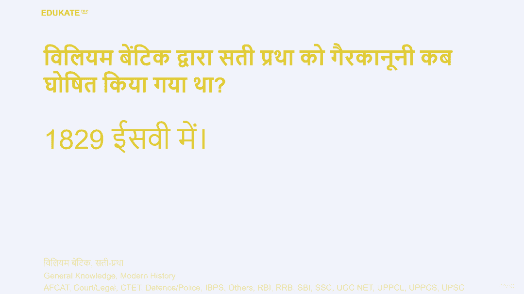 विलियम बेंटिक द्वारा सती प्रथा को गैरकानूनी कब घोषित किया गया था?